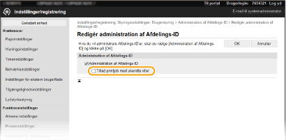 Indstilling af administration af afdelings-id'er til job fra computeren). Hvis afkrydsningsfeltet er valgt for denne indstilling, udføres jobbene dog, også selv om der ikke er indtastet id og pinkode. Hvis du ønsker at konfigurere en indstilling, så der ikke udføres noget job, med mindre korrekt afdelings-id og pinkode bliver indtastet, skal du fjerne markeringen i afkrydsningsfeltet.