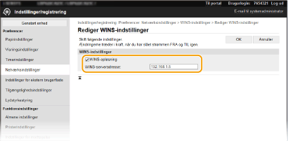 Hvis du vil angive WINS-serverindstillinger, skal [Indstillinger for Computernavn/Arbejdsgruppenavn] være angivet. Konfigurering af computernavn og arbejdsgruppenavn Hvis du fjerner markeringen i afkrydsningsfeltet [Brug NetBIOS] i [Indstillinger for Computernavn/Arbejdsgruppenavn], vil WINS-indstillingen blive deaktiveret. Sørg for at vælge afkrydsningsfeltet [Brug NetBIOS], når du bruger WINS. Funktionen er ikke tilgængelig i et IPv6-netværk. |