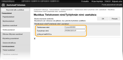Työryhmän nimi on nimi, jota käytetään useiden tietokoneiden ryhmittelyyn niin, että perusverkkotoiminnot, kuten tiedostojen jakaminen, ovat käytettävissä Windows-verkossa. Syötä aakkosnumeerisilla merkeillä sen työryhmän nimi, johon laite kuuluu.