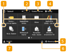 на панели управления. Этот экран служит для выбора параметров и регистрации функций.![]() | Смена страницыСлужит для открытия другой страницы на экране Главный. Изменить страницу также можно, проведя в сторону пальцем по экрану. Оставшийся объем тонера в картриджахСтупенчато отображает оставшееся количество тонера в картриджах. <Провер. счетчик>Показывает общее число распечаток. Просмотр значения счетчика <Выход>Эта клавиша служит для завершения сеанса работы с аппаратом. <Монитор сост.>Служит для проверки состояния печати, просмотра истории использования или таких настроек сети, как IP-адрес аппарата. Можно также проверить состояние аппарата, например оставшееся количество бумаги и тонера в картридже, а также наличие ошибок. Экран <Монитор состояния> Значок проводной или беспроводной локальной сетиЗначок проводной или беспроводной локальной сети отображается, когда аппарат подключен к соответствующей сети. Если нажать на этот значок, можно будет настроить параметры проводной или беспроводной локальной сети. <Сеть> Имя/идентификатор пользователяОтображается имя или идентификатор пользователя, выполнившего вход. |