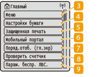 ![]() | <Меню>Данная клавиша позволяет задавать <Настройки функций>, <Настройки> и многие другие настройки аппарата. Список меню настройки <Настройки бумаги>Эта кнопка используется для указания формата и типа бумаги, загруженной в лоток для бумаги и в универсальный лоток. Указание формата и типа бумаги <Защищенная печать>Эта функция позволяет напечатать защищенный документ. Печать документа, защищенного PIN-кодом (защищенная печать) <Мобильный портал>Служит для установления подключения к мобильному устройству. Подключение мобильных устройств <Поряд.отоб. (гл.экр)>Служит для изменения порядка расположения кнопок на экране Главный. Настройка экрана Главный <Проверить счетчик>Показывает общее число распечаток. Просмотр значения счетчика <Парам. беспр. ЛВС.>Эта кнопка служит для настройки параметров беспроводной локальной сети. Подключение к беспроводной локальной сети |