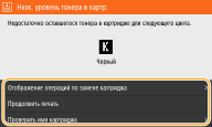 Это сообщение уведомляет о том, что вскоре потребуется замена картриджа. Проверьте наличие картриджа для замены. Замените картридж, если это сообщение появилось перед печатью большого задания. Оно отображается, когда для параметра <Действие при предупреждении> задано значение <Остановить печать> (