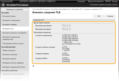 Использование панели управленияМожно также включить или отключить функцию зашифрованного обмена данными TLS в <Меню> на экране Главный. <Удаленный ИП>/<Исп. удаленный ИП> Запуск Удаленного ИП с протоколом TLSЕсли вы попытаетесь запустить Удаленный ИП с включенным протоколом TLS, вам может быть показано предупреждение системы безопасности о сертификате безопасности. В этом случае проверьте правильность URL-адреса, введенного в поле адреса, а затем переходите к открытию экрана Удаленный ИП. Запуск Удаленного ИП Использование TLS для шифрования приема интернет-факсовЕсли сервер POP3 поддерживает протокол TLS, доступна возможность включить TLS для связи с данным сервером (Настройка параметров приема интернет-факса). Для получения дополнительных сведений о настройках сервера POP3 обратитесь к поставщику интернет-услуг или администратору сети. |