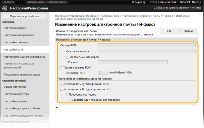 Данный параметр определяет интервал (в минутах) автоматического подключения к серверу POP3. Если на сервере имеются документы интернет-факса, они будут автоматически приняты и напечатаны.
