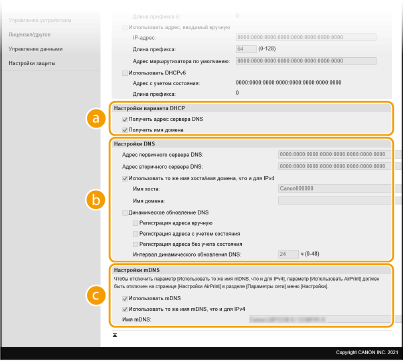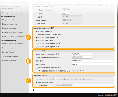 2 | Настройте параметры DNS IPv4. ![]() [Настройки варианта DHCP][Получить имя хоста] Установите этот флажок, чтобы включить параметр 12 для получения имени узла от сервера DHCP. [Динамическое обновление DNS] Установите этот флажок, чтобы включить параметр 81 для динамического обновления записей DNS посредством сервера DHCP. [Получить адрес сервера DNS] Установите этот флажок, чтобы включить параметр 6 для получения адреса DNS-сервера от сервера DHCP. [Получить имя домена] Установите этот флажок, чтобы включить параметр 15 для получения имени домена от сервера DHCP. [Получить адрес сервера WINS] Установите этот флажок, чтобы включить параметр 44 для получения адреса сервера WINS от сервера DHCP. [Получить адрес сервера POP] Установите этот флажок, чтобы включить параметр 70 для получения адреса POP3-сервера от сервера DHCP. [Настройки DNS][Адрес первичного сервера DNS] Введите IP-адрес DNS-сервера. [Адрес вторичного сервера DNS] Введите IP-адрес дополнительного DNS-сервера (если есть). [Имя хоста] Введите имя узла аппарата (цифры и буквы), которое будет зарегистрировано для DNS-сервера. [Имя домена] Введите имя домена (буквы и цифры), к которому принадлежит устройство (например, "example.com"). [Динамическое обновление DNS] Установите флажок для динамического обновления записей DNS при каждом изменении IP-адреса аппарата. При указании интервала между обновлениями задайте значение времени в текстовом поле [Интервал динамического обновления DNS]. [Настройки mDNS][Использовать mDNS] Используемый Bonjour, протокол mDNS (многоадресный DNS) представляет собой протокол, связывающий имя узла с IP-адресом без использования DNS. Чтобы включить mDNS, установите флажок и введите имя mDNS в текстовом поле [Имя mDNS]. |