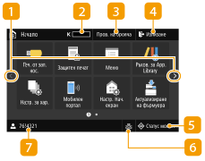 ![]() | <Печ. от зап. нос.>Отпечатва файлове, съхранени на USB памет. Отпечатване от USB памет (Отпечатване от запаметяващ носител) <Защитен печат>Използвайте тази функция за отпечатване на защитен документ. Отпечатване на документ, защитен с PIN код (Защитен печат) <Меню><Настройки на функция>, <Предпочитания> и много други настройки на устройството се стартират от този бутон. Списък на меню с настройки <Ръков. за App. Library>Показва описание на Application Library (Библиотека с приложения). <Настр. за хар.>Този бутон се използва за указване на формата и типа на хартията, заредена в касетата за хартия и многофункционалната тава. Задаване на формат и тип на хартията <Мобилен портал>Използвайте този бутон за установяване на връзка с мобилно устройство. Свързване с мобилни устройства <Настр. Нач. екран>Позволява ви да промените реда, в който се показват бутоните на екрана Начало. Персонализиране на екрана Начало <Актуализиране на фърмуер>Позволява ви да актуализирате фърмуера през интернет. Актуализиране на фърмуера |