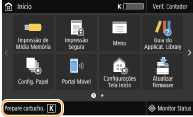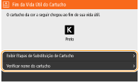 Especifique quando deve aparecer uma mensagemPode definir qualquer valor como a percentagem de toner restante no cartucho que desencadeia a mensagem. <Exibir Tempo para Prep. Cart.>/<Exibir Tempo para Prep. Cartucho Notif.>