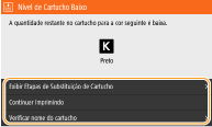 Se for apresentada uma mensagem durante a receção de um documento de I-Fax, a máquina não imprime para evitar uma impressão pouco nítida. Para continuar a imprimir mesmo com pouca quantidade restante na cartridge de toner, defina <Continue Imp Qdo Cart Baixo>/<Continue Imprimindo. Qdo Qde Cart Baixa> como <Ativado>. <Continue Imp Qdo Cart Baixo>/<Continue Imprimindo. Qdo Qde Cart Baixa>