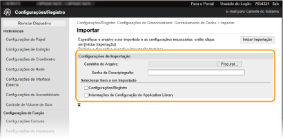 É possível guardar os dados das definições da máquina no computador (exportação). Os dados guardados no computador também podem ser registados na máquina (importação). Os dados exportados desta máquina podem ser importados para outra máquina do mesmo modelo. Por isso, pode facilmente copiar uma diversidade de dados de definições para várias máquinas. Para utilizar estas funções, é necessário iniciar sessão no Modo do Administrador de Sistema.