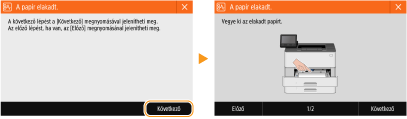 Amikor hiba lép fel, bizonyos esetekben a hiba elhárítására vonatkozó útmutatás jelenik meg a kijelzőn. A probléma megoldásához kövesse a kijelzőn látható utasításokat. Az alábbi ábrán például a papírelakadáskor megjelenő képernyő látható.