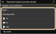 Az alapértelmezett papírbeállítás bejegyzése után a papírok behelyezésekor nem jelenik meg a papírbeállító képernyő, a készülék mindig ugyanazt a beállítást alkalmazza. Ha a papírbeállítások módosítása nélkül helyez be más méretű vagy típusú papírt, akkor a készülék valószínűleg nem megfelelően fog nyomtatni. A probléma kikerüléséhez válassza a <Megadás a papír betöltésekor> lehetőséget a 3. lépésben, majd töltse be a papírt.