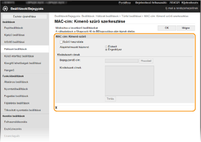 Ha helytelen MAC-címeket ad meg, előfordulhat, hogy nem fog tudni hozzáférni a készülékhez a Távoli felhasználói felületről. Ebben az esetben a <MAC-cím szűrő> beállítást a <Ki> értékre kell állítani. <MAC-cím szűrő>