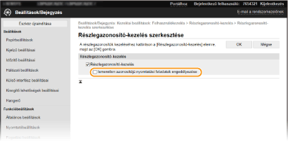 Számítógépről végezhető részlegazonosító-kezelés beállítása a feladatokhoz). Ha azonban e beállításnál bejelölték a jelölőnégyzetet, a rendszer akkor is végrehajtja a feladatokat, ha a felhasználó nem adja meg az azonosítót és a PIN-kódot. Ha szeretné elérni, hogy a megfelelő részlegazonosító és PIN-kód megadása nélkül ne lehessen feladatokat végrehajtani, törölje a jelet a jelölőnégyzetből.