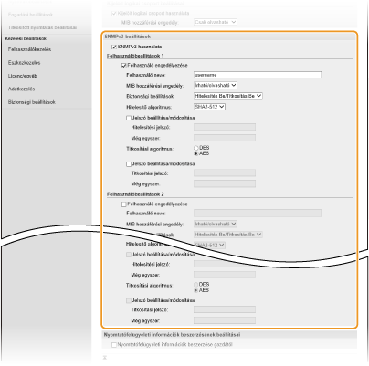 Az egyszerű hálózatfelügyeleti protokoll (SNMP) olyan protokoll, amellyel egy felügyeleti információs bázis (MIB) alapján figyelhetők és vezérelhetők egy hálózat kommunikációs eszközei. A készülék az SNMPv1 és a megerősített biztonságú SNMPv3 protokollt támogatja. Amikor dokumentumokat nyomtat vagy a Távoli felhasználói felületet használja, a számítógépről ellenőrizheti a készülék állapotát. Engedélyezheti az SNMPv1 vagy a SNMPv3 protokollt, illetve mindkettőt egyszerre. A hálózati környezetnek és a felhasználási céljának megfelelően adja meg mindegyik verzió beállításait.