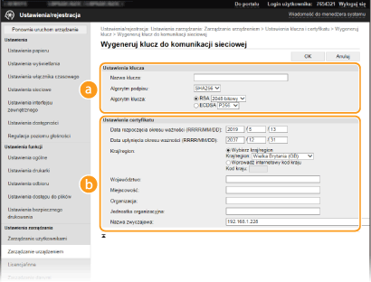 Klucz i certyfikat można wygenerować za pomocą urządzenia, jeśli wymaga tego komunikacja szyfrowana z użyciem protokołu Transport Layer Security (TLS). Z szyfrowania TLS można korzystać podczas udzielania dostępu do urządzenia przez Zdalny interfejs użytkownika. Wraz z kluczem i certyfikatem wygenerowanymi w menu „Komunikacja sieciowa” używane są certyfikaty z podpisem własnym.