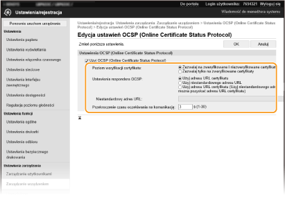 Gdy wybrano [Użyj niestandardowego adresu URL] lub [Użyj adresu URL certyfikatu (Użyj niestandardowego adresu URL, jeśli nie można pozyskać adresu URL certyfikatu)], wprowadź adres URL urządzenia odpowiadającego OCSP (tylko kod ASCII, maksymalnie 255 znaków).