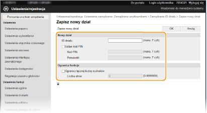 Rejestrowanie identyfikatora wydziału i ustawienie dla niego kodu PIN. Zarejestruj wszystkie identyfikatory wydziału, którymi chcesz zarządzać.