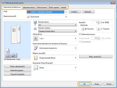 Wybierz sterownik drukarki dla urządzenia i kliknij przycisk [Preferencje] albo [Właściwości].