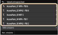 Môžete vyhľadať bezdrôtové smerovače (alebo prístupové body) dostupné na pripojenie a na displeji zariadenia si z nich jeden vybrať. Ako sieťový kľúč zadajte šifrovací kľúč/heslo alebo kľúč WEP/PSK. Pred výberom bezdrôtového smerovača skontrolujte a zapíšte si požadované údaje nastavenia vrátane SSID a sieťového kľúča (