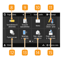 Paspauskite, jei norite patikrinti spausdinimo būseną, peržiūrėti naudojimo istoriją arba aparato tinklo parametrus, pvz., IP adresą. Taip pat galima patikrinti aparato būseną, pavyzdžiui, popieriaus likutį arba dažomųjų miltelių lygį kasetėse, arba peržiūrėti, ar neįvyko klaidų. Ekranas <Būsenos ekranas>
