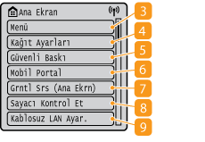 Kablolu LAN'a bağlanırken Kablolu LAN simgesi, kablosuz LAN'a bağlanırken de Kablosuz LAN simgesi görüntülenir. Kablolu/kablosuz LAN ayarlarını yapılandırmak için bu simgeye basın. <Ağ>