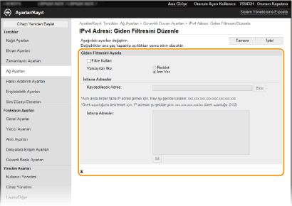 IP adresleri yanlış girildiyse Uzak Kullanıcı Arabiriminden makineye erişemeyebilirsiniz ve bu durumda <IPv4 Adres Filtresi> veya <IPv6 Adres Filtresi> öğesini <Kapalı> durumuna getirmeniz gerekir.