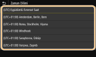 Geçerli tarih ve saati ayarlamadan önce <Zaman Dilimi> öğesini ayarlayın. <Zaman Dilimi> ayarı daha sonra değiştirilirse, geçerli tarih ve saat ayarı da uygun şekilde değişir.