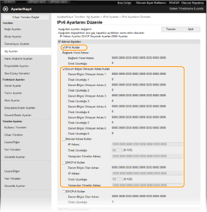 Makinenin IPv6 adresleri, Uzak Kullanıcı Arabirimi aracılığıyla yapılandırılabilir. IPv6 adreslerini ayarlamadan önce IPv4 adres ayarlarını kontrol edin (IPv4 Ayarlarını Görüntüleme). IPv6 adreslerini kullanmak için doğru IPv4 ayarlarını ayarlamanız gerekir. Makine, aşağıdaki IPv6 adreslerinden birden fazlasını kullanabilir: