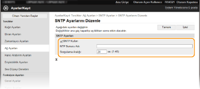 NTP/SNTP sunucusu ile iletişimi test etme[SNTP Ayarları] bölümünde [Ayarlar/Kayıt]