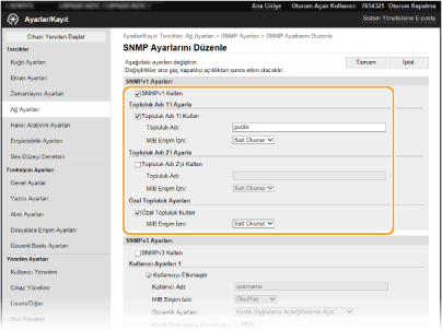 SNMP'nin her iki sürümü de etkinleştirilirse, SNMPv1'deki MIB erişim izninin [Salt Okunur] olarak ayarlanması önerilir. MIB erişim izni, SNMPv1'de ve SNMPv3'te bağımsız olarak (ve SNMPv3'teki her kullanıcı için) ayarlanabilir. SNMPv1'de [Oku/Yaz] (tam erişim izni) seçildiğinde, makine ayarlarının çoğu SNMPv1 ile kontrol edilebildiğinden, SNMPv3'ü nitelendiren sağlam güvenlik özellikleri olumsuz etkilenir.