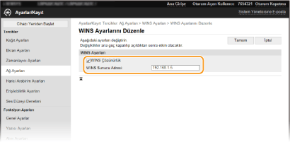 [Bilgisayar Adı/Çalışma Grubu Adı Ayarları] içinde [NetBIOS Kullan] onay kutusunun işaretini kaldırırsanız WINS ayarı devre dışı kalır. WINS kullanırken [NetBIOS Kullan] onay kutusunu seçtiğinizden emin olun.
