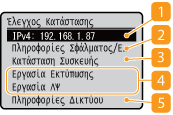 Εμφανίζει τις ρυθμίσεις δικτύου, όπως η διεύθυνση IP της συσκευής και η κατάσταση, όπως η κατάσταση επικοινωνίας ασύρματου LAN.
