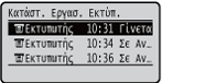 Εμφανίζει την τρέχουσα κατάσταση του επιλεγμένου στοιχείου. Παρακάτω απεικονίζεται η οθόνη <Κατάστ. Εργασ. Εκτύπ.> ως παράδειγμα.