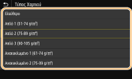 Αν αλλάζετε συχνά το χαρτί που τοποθετείτε, ορίστε την επιλογή <Ελεύθερο>. Αυτό θα μειώσει τον αριθμό των βημάτων που απαιτούνται για να αλλάζετε κάθε φορά τη ρύθμιση. Ωστόσο, σημειώστε ότι αυτή η ρύθμιση δίνει στη συσκευή τη δυνατότητα να εκτελέσει εκτύπωση ακόμα κι αν υπάρχει αναντιστοιχία ανάμεσα στη ρύθμιση για τον τύπο χαρτιού στο πρόγραμμα οδήγησης εκτυπωτή και στον τύπο χαρτιού που είναι τοποθετημένο στη συσκευή.