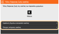Μπορείτε να ορίσετε οποιαδήποτε τιμή ως ποσοστό επί της υπολειπόμενης ποσότητας γραφίτη στην κασέτα για την ενεργοποίηση μηνύματος. <Εμφ. χρον. για προετ. κασέτας>/<Εμφάν. Χρον. Ειδοποίησης Προετ. Κασέτας>