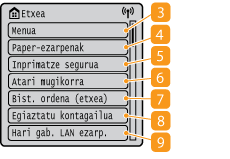 Sakatu inprimatze-egoera ikusteko, erabilera-historia begiratzeko edo makinaren IP helbidea bezalako sare-ezarpenak begiratzeko. Makinaren egoera ere egiazta dezakezu; adibidez, gelditzen den papera edo gelditzen diren toner-kartutxoak, edo errorerik gertatu baden. <Egoera-kud.> pantaila