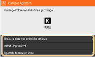 I-Fax bat jasotzen den bitartean mezu bat agertzen bada, makinak ez du inprimatuko inprimatze ez garbiak saiheste aldera. Jasotako datuak memorian gordeko dira, ordea. Toner-kartutxoan geratzen den kantitatea agortzen ari bada ere inprimatzen jarraitzeko, ezarri <Jarr. inpr. ia hutsik badago.>/<Jarr. inpr. kart. tinta gutxi geratzean.> hona: <Aktibatuta>. <Jarr. inpr. ia hutsik badago.>/<Jarr. inpr. kart. tinta gutxi geratzean.>