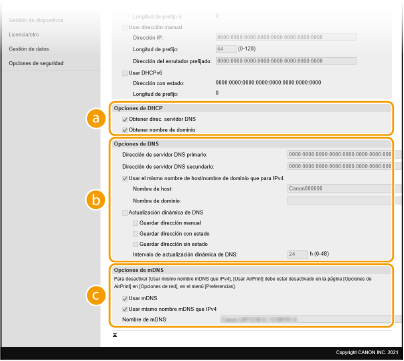 2 | Configure las opciones de DNS IPv4. ![]() [Opciones de DHCP][Obtener nombre de host] Seleccione la casilla de verificación para habilitar la Opción 12 y obtener el nombre de host del servidor DHCP. [Actualización dinámica de DNS] Seleccione la casilla de verificación para habilitar la Opción 81 y actualizar dinámicamente los registros DNS a través del servidor DHCP. [Obtener direc. servidor DNS] Seleccione la casilla de verificación para habilitar la Opción 6 y obtener una dirección de servidor DNS desde el servidor de DHCP. [Obtener nombre de dominio] Seleccione la casilla de verificación para habilitar la Opción 15 y obtener un nombre de dominio desde el servidor de DHCP. [Obtener direc. servidor WINS] Seleccione la casilla de verificación para habilitar la Opción 44 y obtener una dirección de servidor WINS desde el servidor de DHCP. [Obtener direc. servidor POP] Seleccione la casilla de verificación para habilitar la Opción 70 y obtener una dirección de servidor POP3 desde el servidor de DHCP. [Opciones de DNS][Dirección de servidor DNS primario] Introduzca la dirección IP de un servidor DNS. [Dirección de servidor DNS secundario] Introduzca la dirección IP de un servidor DNS secundario, si existe. [Nombre de host] Introduzca caracteres alfanuméricos en el nombre de host del equipo que vaya a registrar en el servidor DNS. [Nombre de dominio] Introduzca caracteres alfanuméricos en el nombre del dominio al que pertenezca el equipo, como "ejemplo.com". [Actualización dinámica de DNS] Seleccione la casilla de verificación para actualizar dinámicamente los registros DNS cuando cambie la dirección IP del equipo. Cuando especifique el intervalo entre las actualizaciones, introduzca el tiempo en horas en el cuadro de texto [Intervalo de actualización dinámica de DNS]. [Opciones de mDNS][Usar mDNS] Adoptado por Bonjour, mDNS (DNS multidifusión) es un protocolo para relacionar un nombre de host con una dirección IP sin utilizar DNS. Seleccione la casilla de verificación para activar mDNS e introduzca el nombre de mDNS en el cuadro de texto [Nombre de mDNS]. |