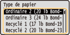 Si vous changez fréquemment de type de papier, vous pouvez sélectionner <Libre>. Cette option réduit le nombre d'étapes nécessaire pour modifier les réglages pour le type de papier à chaque impression. Notez toutefois qu'avec ce réglage l'appareil exécute l'impression même si le type de papier sélectionné dans le pilote d'imprimante diffère de celui du papier chargé dans l'appareil.