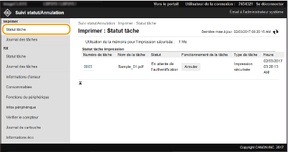 Tous les documents en cours d'impression ou sur le point de l'être figurent dans la liste, quel que soit le réglage choisi pour la gestion des numéros de service. Si vous avez saisi votre nom d'utilisateur en mode Utilisateur général, votre nom d'utilisateur ne s'affiche que sur les documents que vous imprimez. Cliquez sur [Numéro de tâche] pour les documents dont l'impression est suspendue et les documents sécurisés pour afficher leurs informations détaillées. Vous pouvez vérifier le nom de l'utilisateur et le nombre de pages sur le document imprimé. |