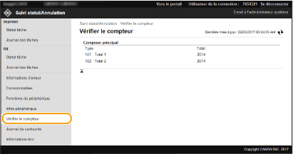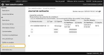 Le format et le type de papier de la source ainsi que le numéro de modèle de cartouche de toner, notamment, sont également affichés. Vous pouvez également cliquer sur [Vérifier les détails des consommables], dans la page du portail (page principale) pour afficher cette page (