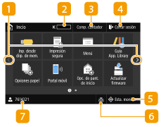 en el panel de control. Utilice esta pantalla para especificar la configuración y registrar funciones.![]() | Cambiar de páginaUtilícelo para ver otra página de la pantalla Inicio. También puede deslizar el dedo lateralmente para cambiar de página. Cantidad restante de tóner en los cartuchosMuestra la cantidad de tóner restante en los cartuchos por fases. <Comp. contador>Muestra el volumen total de impresiones. Visualización del valor del contador <Cerrar sesión>Utilice este botón para cerrar la sesión en el equipo. <Esta. monitor>Púlsela para consultar el estado de impresión, para ver el historial de uso o para ver las opciones de red, como puede ser la dirección IP del equipo. Asimismo, podrá consultar el estado del equipo, como por ejemplo, la cantidad restante de papel y la cantidad de tóner restante en los cartuchos, o si se ha producido algún error. Pantalla <Monitor de estado> Icono de LAN con cable/LAN inalámbricaEl icono de LAN con cable aparece cuando se conecta a una LAN con cable y el icono de LAN inalámbrica aparece cuando se conecta a una LAN inalámbrica. Pulse este icono para configurar las opciones de LAN con cable/inalámbrica. <Red> Nombre de usuario/IDSe muestra el nombre o ID del usuario que ha iniciado sesión. |