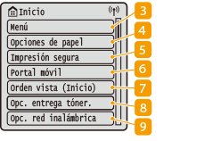 ![]() | <Menú><Opciones de funciones>, <Preferencias>, y muchas otras configuraciones del equipo se inician desde este botón. Lista del menú de configuración <Opciones de papel>Este botón se utiliza para especificar el tamaño y el tipo de papel cargado en el casete y en la bandeja multiuso. Especificación del tamaño y tipo de papel <Impresión segura>Utilice esta función para imprimir un documento protegido . Impresión de un documento protegido con un PIN (Impresión Segura) <Portal móvil>Utilícelo para establecer una conexión con un dispositivo móvil. Conectar con dispositivos móviles <Orden vista (Inicio)>Permite cambiar el orden en el que se muestran los botones de la pantalla Inicio. Personalización de la pantalla Inicio <Opc. entrega tóner.>Puede configurar las opciones del servicio de reposición de tóner. Para usar el servicio de reposición de tóner es preciso registrarse con determinados distribuidores. Este servicio solo está disponible en algunos países/regiones y para determinados modelos. <Opc. red inalámbrica>Use este botón para configurar las opciones de LAN inalámbrica. Conexión a una LAN inalámbrica |