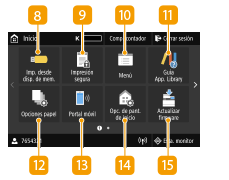 ![]() | <Imp. desde disp. de mem.>Imprime archivos almacenados en un dispositivo de memoria USB. Impresión desde memoria USB (Impresión desde dispositivo de memoria) <Impresión segura>Utilice esta función para imprimir un documento protegido . Impresión de un documento protegido con un PIN (Impresión Segura) <Menú><Opciones de funciones>, <Preferencias>, y muchas otras configuraciones del equipo se inician desde este botón. Lista del menú de configuración <Guía App. Library>Muestra una descripción de la Biblioteca de aplicaciones. <Opciones papel>Este botón se utiliza para especificar el tamaño y el tipo de papel cargado en el casete y en la bandeja multiuso. Especificación del tamaño y tipo de papel <Portal móvil>Utilícelo para establecer una conexión con un dispositivo móvil. Conectar con dispositivos móviles <Opc. de pant. de inicio>Permite cambiar el orden en el que se muestran los botones de la pantalla Inicio. Personalización de la pantalla Inicio <Actualizar firmware>Le permite actualizar el firmware a través de Internet. Actualización del firmware |