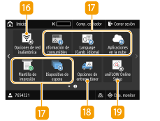 ![]() | <Opciones de red inalámbrica>Utilice este botón para configurar las opciones de la LAN inalámbrica. Conexión a una LAN inalámbrica Botón Application Library (Biblioteca de aplicaciones)Puede utilizar estos botones para ejecutar una función cómodamente con el método de teclas abreviadas. Para obtener más información, consulte el manual de Application Library (Biblioteca de aplicaciones) en el sitio web de manuales en línea. <Opciones de entrega tóner>Puede configurar las opciones del servicio de reposición de tóner. Para usar el servicio de reposición de tóner es preciso registrarse con determinados distribuidores. Este servicio solo está disponible en algunos países/regiones y para determinados modelos. <uniFLOW Online Setup>Puede verificar el estado de uso del dispositivo y del usuario mediante un enlace al servicio en la nube. Para obtener más información, consulte el sitio web de Canon.
