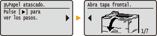 En algunos casos, cuando se produce un error, aparecen instrucciones sobre cómo responder ante dicho error. Siga las instrucciones de la pantalla para solucionar el problema. La pantalla que aparece cuando se produce un atasco de papel se muestra a continuación a modo de ejemplo.
