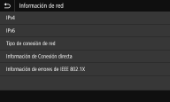 Muestra las opciones de configuración de red, como la dirección IP del equipo, así como el estado, como por ejemplo el de las comunicaciones de red inalámbrica.