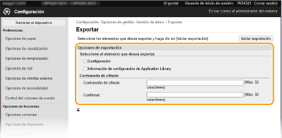 Introduzca una contraseña para cifrar los datos exportados con caracteres alfanuméricos. Introduzca la misma contraseña en [Confirmar]. Para exportar los datos, deberá establecer una contraseña de cifrado.