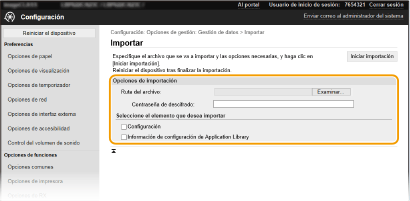Los datos de opciones del equipo pueden guardarse en su ordenador (exportación). Los datos guardados en su ordenador también se pueden registrar en el equipo (importación). Los datos exportados desde este equipo se pueden importar en otro equipo del mimo modelo. Así, podrá copiar fácilmente varios datos de opciones en múltiples equipos. Para utilizar esas características, tiene que haber iniciado una sesión en el modo de Administrador del sistema. |