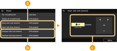 Para <Despl. lado corto (anverso)>/<Desplazar lado corto (reverso)>, especifique un valor con un signo "+" para corregir la posición de impresión en la dirección de izquierda a derecha. Para <Despl. lado largo (anverso)>/<Desplazar lado largo (reverso)>, especifique un valor con un signo "+" para corregir la posición de impresión en la dirección de arriba abajo. Para corregir en la dirección opuesta, especifique un valor con un signo "-".